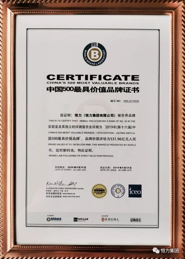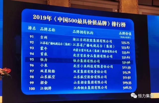 6月26日下午,由世界品牌实验室(World Brand Lab)主办的第十六届“世界品牌大会”在北京举行?;嵘戏⒉剂?019年《中国500最具价值品牌》分析报告,恒力集团“恒力”品牌再度入围2019年“中国500最具价值品牌”,以531.96亿元位列第95位。