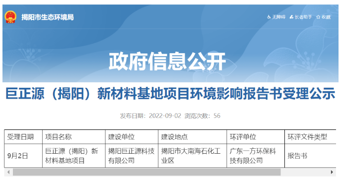 9月2日,巨正源(揭阳)新材料基地项目环境影响报告书进行受理公示,建设单位为巨正源控股的揭阳巨正源科技有限公司,项目总投资156亿元,建设60万吨PDH及下游丙烯酸及酯、EVA、PP等装置。