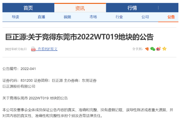 7月1日,巨正源发布"关于竞得东莞市 2022WT019 地块的公告"。据介绍,其子公司东莞巨正源于 2022 年 6 月 29 日在东莞市公共资源交易中心竞得编号为 2022WT019 的地块,该地块位于东莞市沙田镇和安村,用于 120万吨/年丙烷脱氢制高性能聚丙烯项目二期工程的建设。