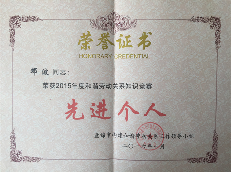 为贯彻党的十八届四中全会精神,推进人力资源和社会保障法制建设进程,切实提高构建和谐劳动关系的能力和水平,根据《中共中央、国务院关于构建和谐劳动关系的意见》文件精神,2015年11月份,在我市范围内开展了和谐劳动关系知识竞赛活动,此次竞赛有256户企业近2500名劳动者参与,我公司邓波同志在此次知识竞赛中,表现优异,荣获“先进个人”称号。