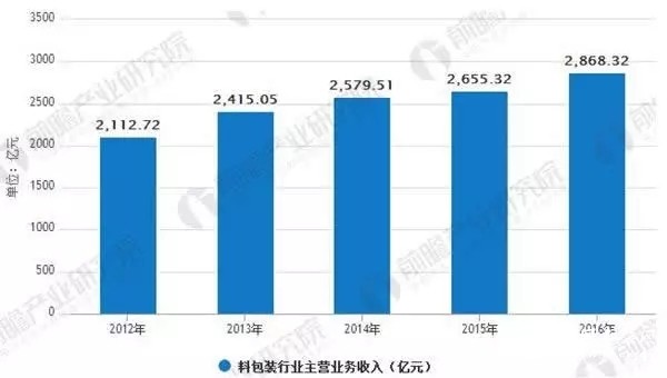 中国塑料包装行业规模庞大,近年来保持持续稳定增长。据前瞻产业研究院发布的《塑料包装行业产销需求与投资预测分析报告》数据显示,2016年中国塑料包装行业实现产品销售收入2868.32亿元,同比增长8.02%,近5年复合增长率达7.94%。