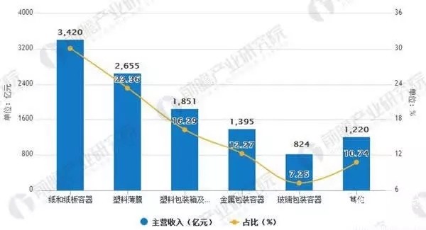 2015年我国各类包装细分行业的主营业务收入分布情况