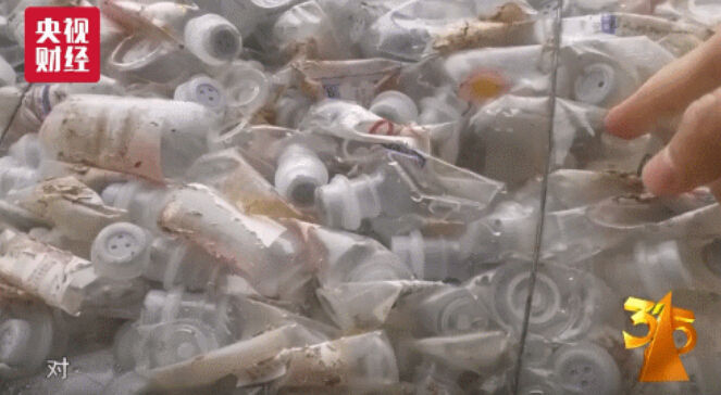 晚会第一爆:是废旧塑料生产加工中的问题,医疗垃圾甚至医疗废物加工成的破碎料,这些破碎料经过简单加工,就变成了这种白色塑料颗粒,业内俗称再生料。