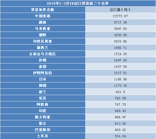 从上表可以看出,2019年1-3月PE出口前十大贸易伙伴依次是中国香港、越南、马来西亚、朝鲜、印度尼西亚、新西兰、台澎金马关税区、伊朗、泰国、沙特阿拉伯,共计出口4.76万吨,占出口总量的75.68%。