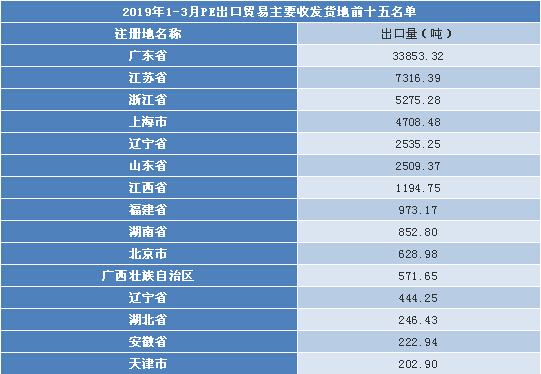 从上表可以看出,贸易区域布局集中化程度高。中国PE出口收发货地主要集中于沿海的广东省、江苏省和浙江省。2019年1-3月广东省、江苏省、浙江省共计出口4.64万吨,占出口总量的75.13%。具体到各省份来看,广东省累计出口3.39万吨,较去年同期增加45.49%;江苏省累计出口0.73万吨,较去年同期增加52.08%;浙江省累计出口0.53吨,较去年同期增加26.19%。